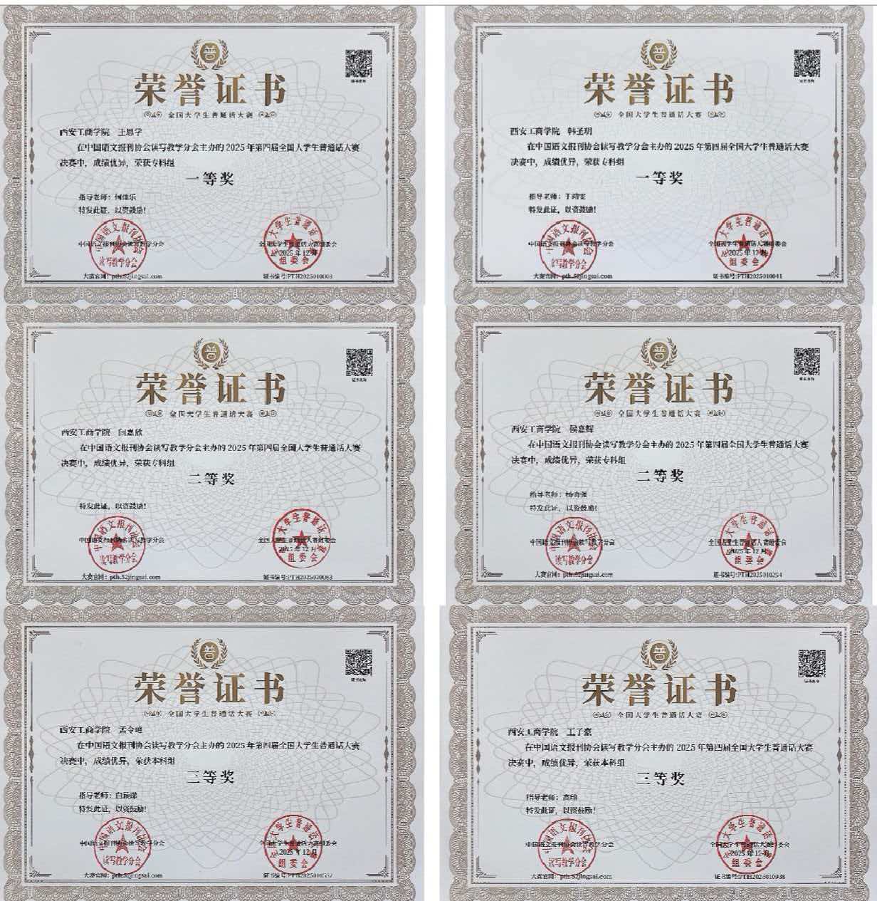 获奖学生证书(部分)